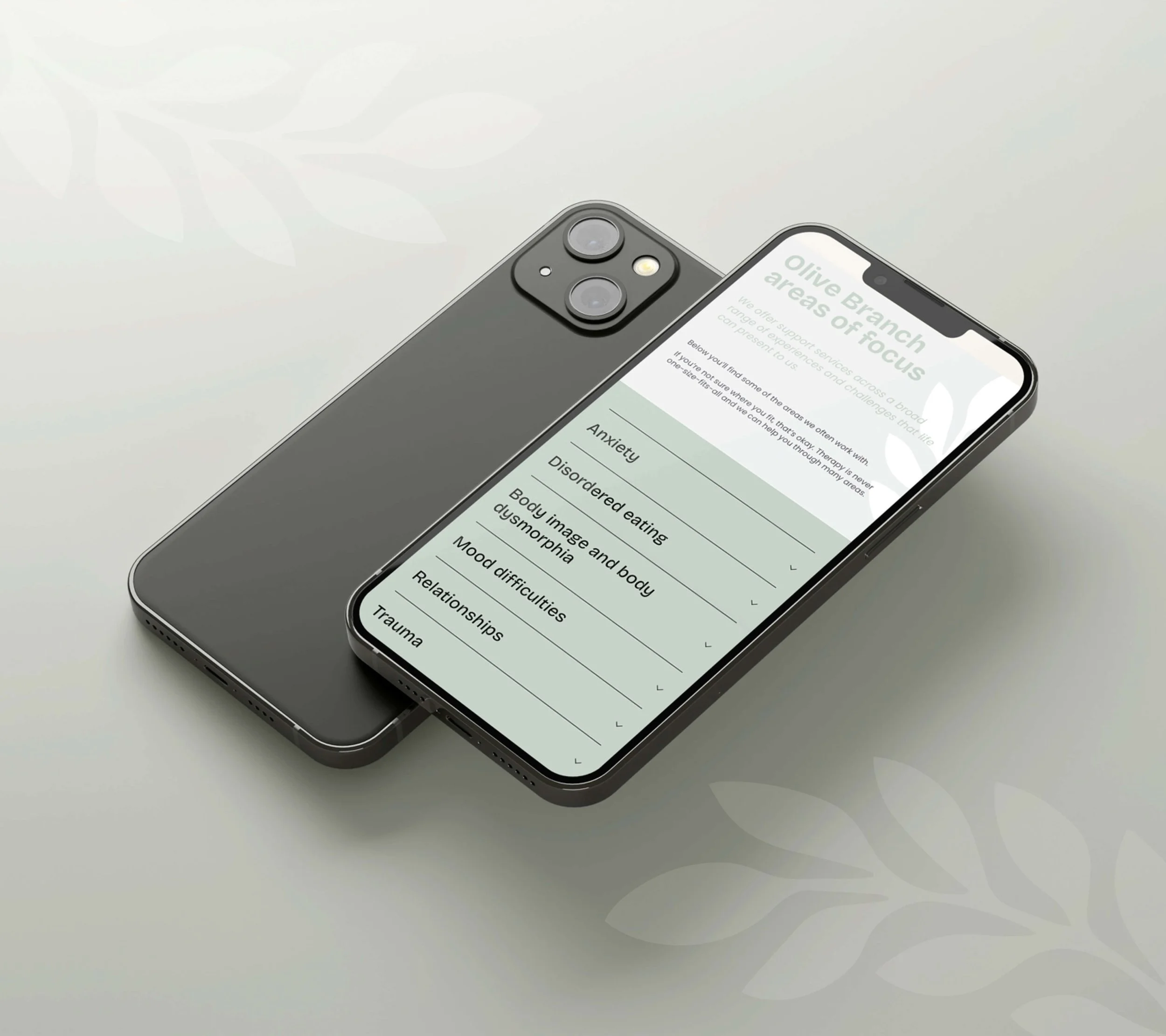 Web design, copywriting and a tailored tone of voice shaped to reflect Olive Branch Psychology’s calm, supportive and client-centred approach.