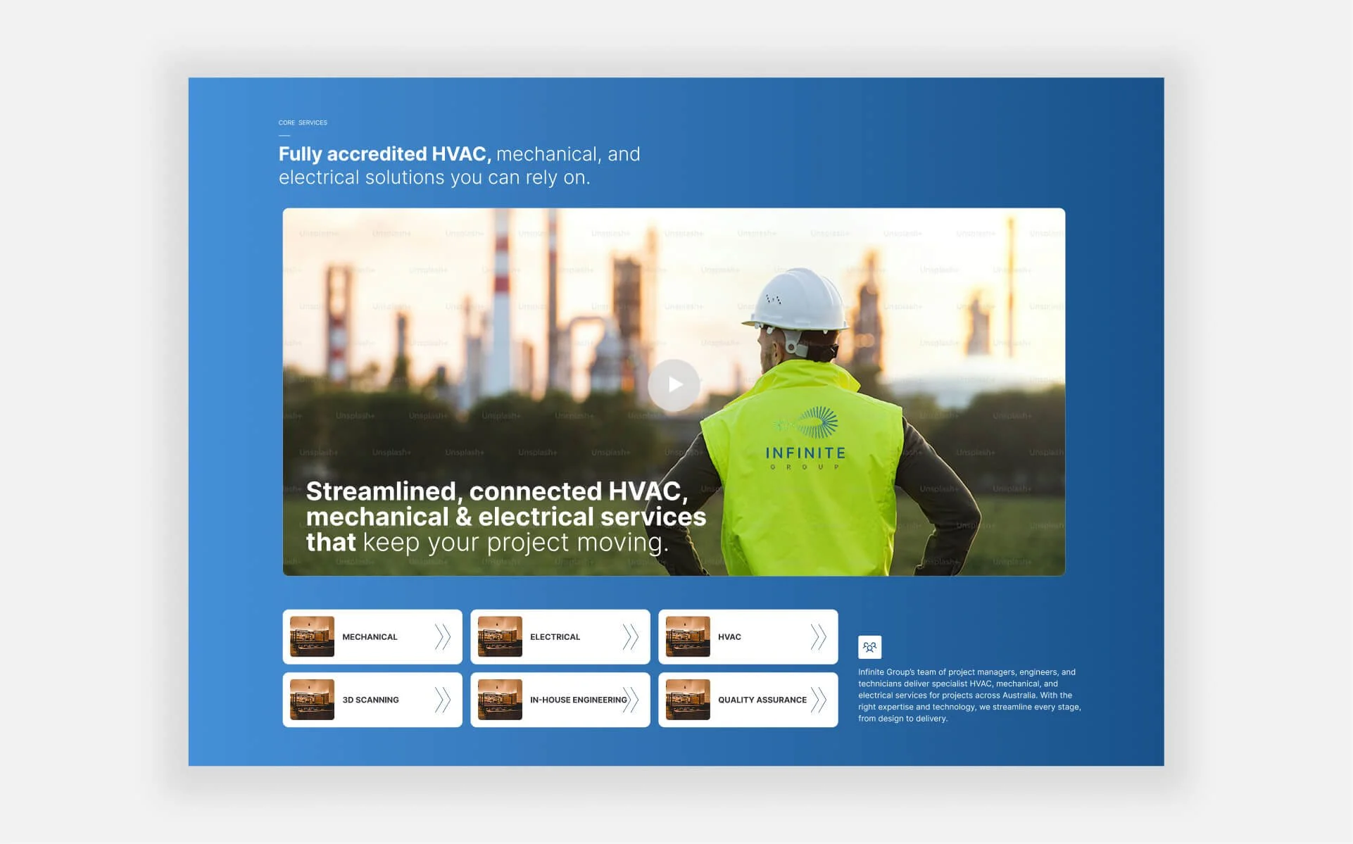 Infinite Group is a Melbourne-based provider of HVAC, mech-electrical, fitout and refurbishment services. Known for their commitment to compliance, quality and safety, they deliver end-to-end mechanical services solutions for commercial, industrial and government sectors.